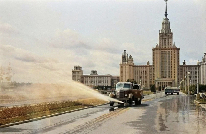 Поливка улиц и газонов у здания МГУ им. М. В. Ломоносова
