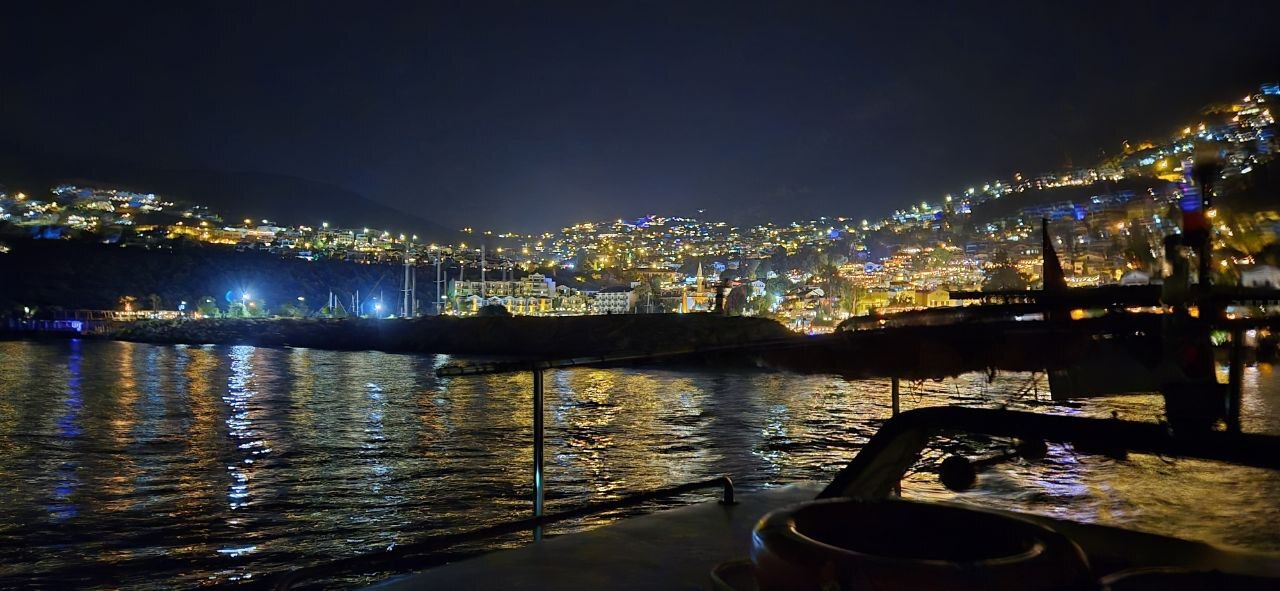 Приблизительно так выглядит Калкан с воды ночью. На первом плане - черный волнорез, за ним мачты яхт (пирс битком). А дальше огни города поднимающиеся на гору