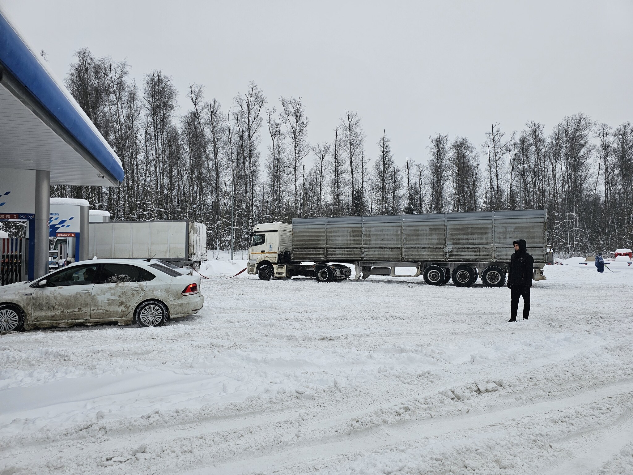 Нам повезло, смогли заехать на АЗС Газпрома. Так выглядела территория заправки, по которой можно было проехать. Фура застряла, ее пытались сдернуть при помощи буксира.
