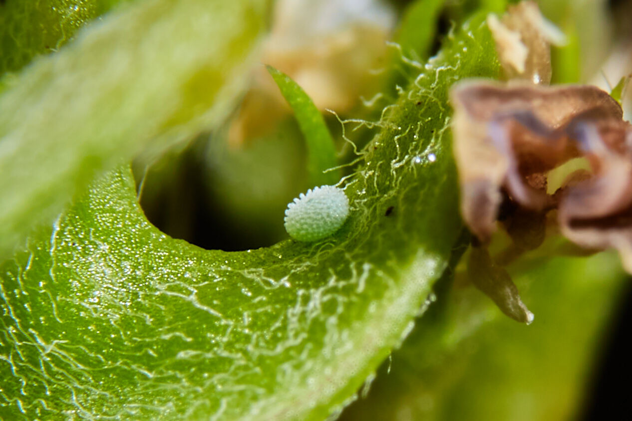 В случае с Икаром видим зеленоватое яйцо, видимо, для маскировки на зелёном фоне растения, и текстура "ёжика", возможно, для лучшего закрепления на субстрате.