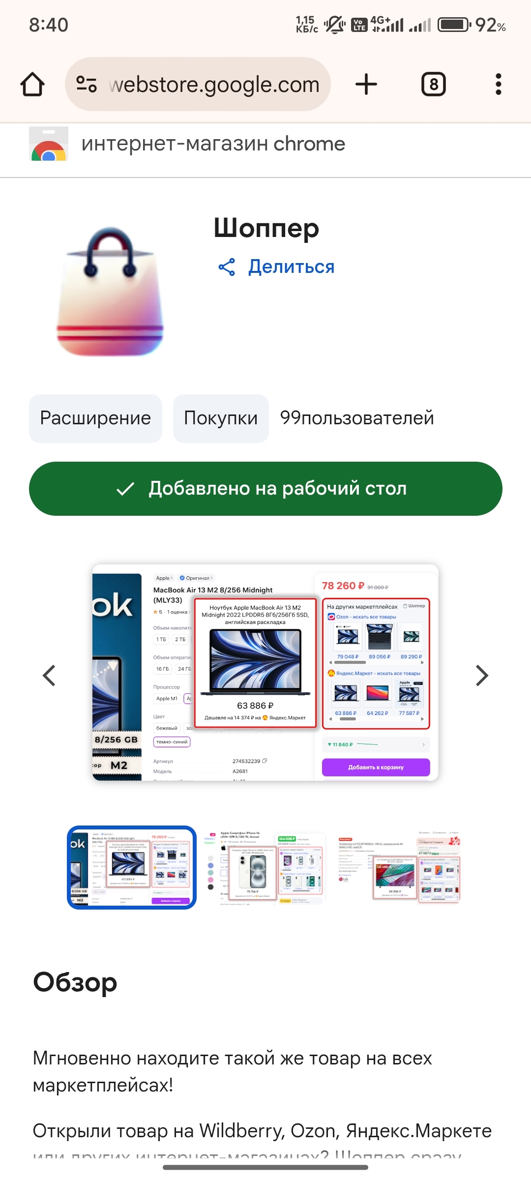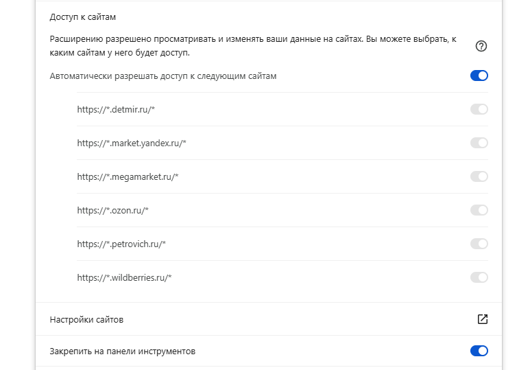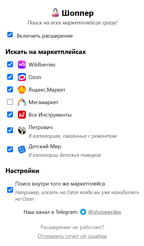 Работает в Wildberries, Ozon, Яндекс.Маркет, Мегамаркет, Детский Мир (в категории "детские товары"), Петрович (в категории "ремонт"). Пока добавил только те сайты, на которых сам часто покупаю, но планирую добавить еще.