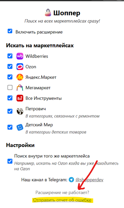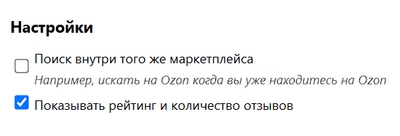 При клике по иконке расширения появляется меню, в котором можно отключить всё расширение или отдельные маркетплейсы, включить поиск внутри активного маркетплейса