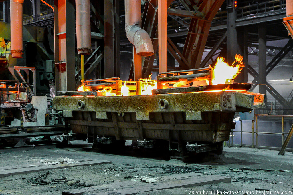 А теперь немного позагораем в горячих цехах. Это Оскольский электрометаллургический комбинат, проще говоря ОЭМК, где плавится сталь.
