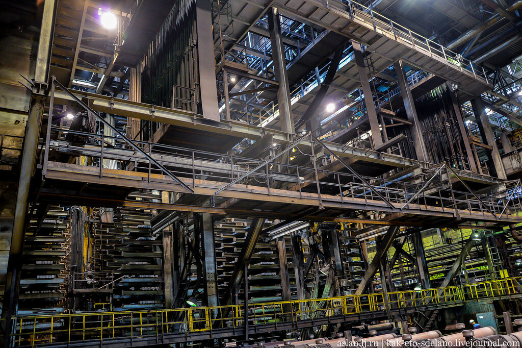 В одном из цехов комбината производят вот такие стальные заготовки. Их длина может достигать от 4 до 12 метров, в зависимости от желания заказчиков. На фото 6-ручьевая машина непрерывного литья заготовок.
