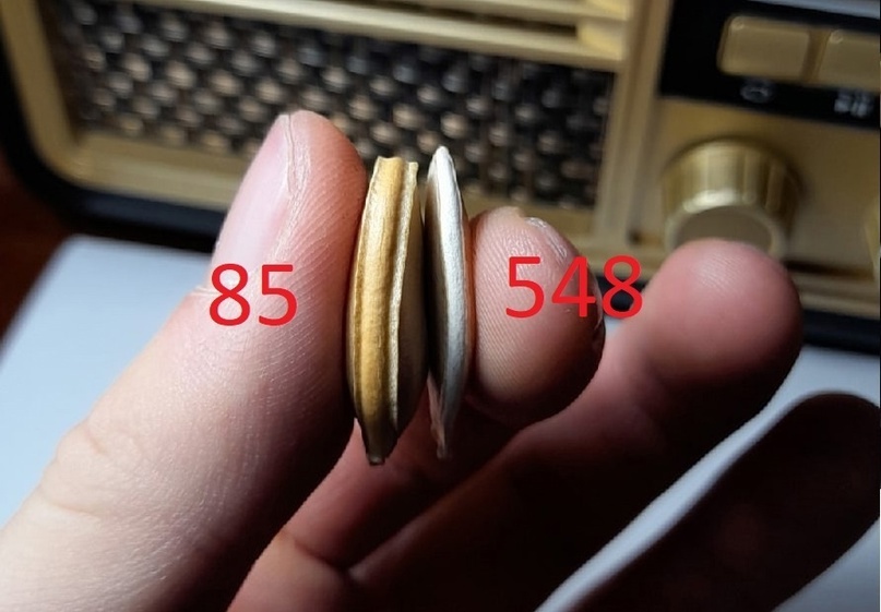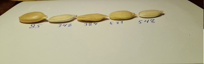 Перед вами пять семян от тыкв, которые различаются по весу, но относятся к одному сорту. При детальном рассмотрение можно обнаружить, что семена имеют разный размер. Как ни странно, семена от тыквы, которая весила 85 кг, гораздо больше, чем семена от тыквы, которая весила 548 кг. Можно подумать, что семена от тыквы 548 кг некачественные, а от тыквы 85 кг то, что надо. Но по факту внешний вид и размер семян не влияет на результат. Дело в том, что за тип семян отвечают не те гены, что за размер плода. Так как этот сорт скрещивают прежде всего по весовому признаку, то все остальные признаки могут хаотично проявляться. Одним из таких признаков является размер семени.