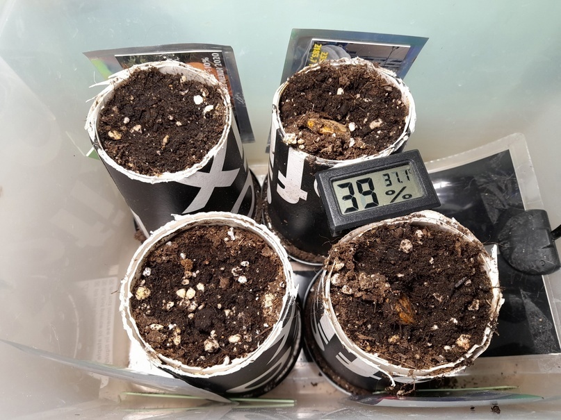 Второй путь - это сразу посеять семена в горшки. Кстати, земля должна быть максимально легкой и рыхлой. Не жалейте агроперлита, можно смело добавлять 20-30% от общего объема в грунт. Сажать семена стоит или сразу в финальные емкости объемом 5-10 л (я рекомендую 5л), или сначала в стаканчики, а потом - пересадка из стаканчиков в финальные емкости. Не забывайте, что мы держим температуру 30 градусов, и если вы не можете обеспечить такую температуру в больших горшках, то лучше тогда сеять сначала в стаканчики.