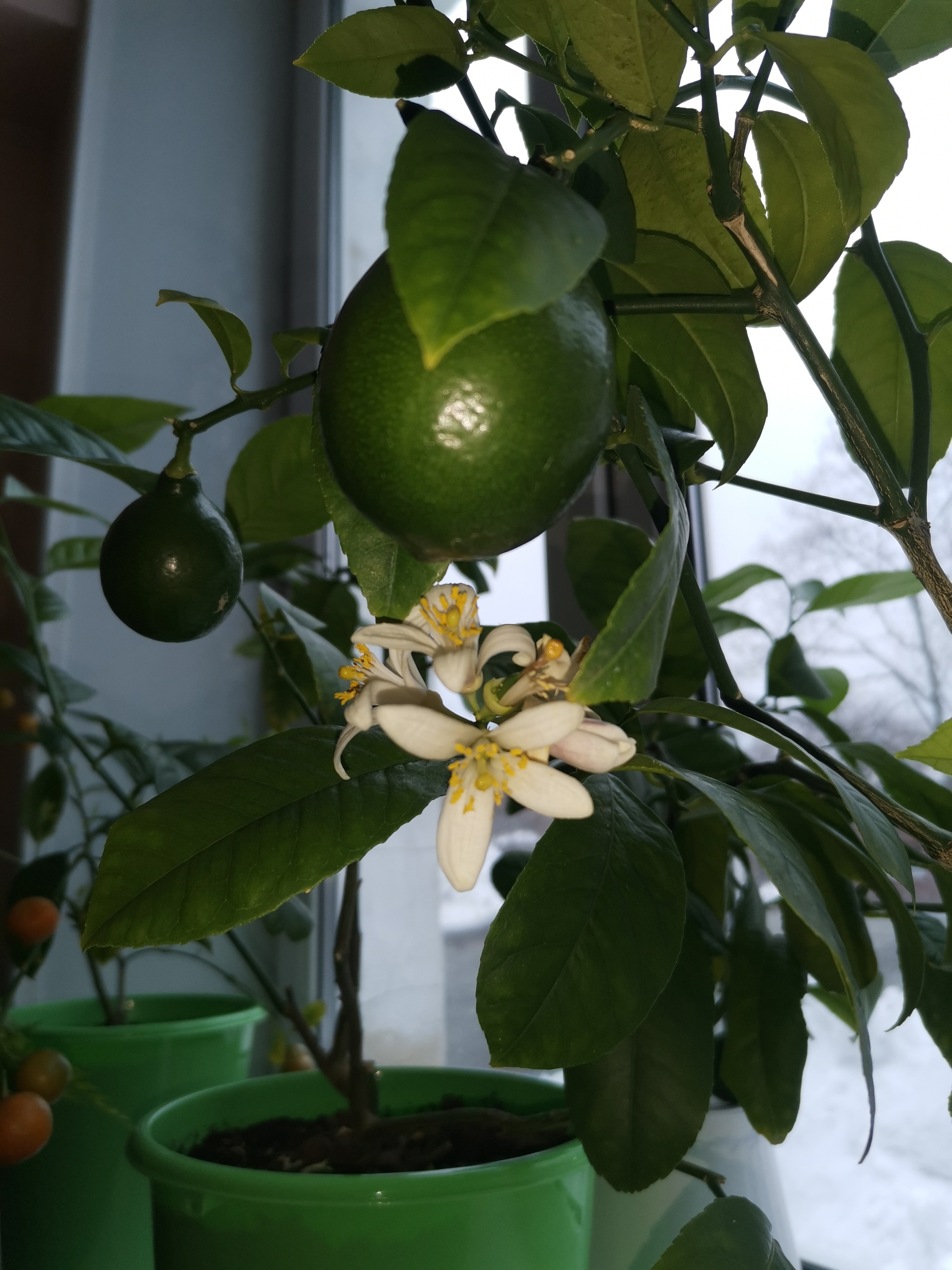 И радуемся, как дети, когда аромат жасмина и апельсина(на мой нюх) крупных, белоснежных, с зелёнцой у основания, цветков лимона сменяется тугими, блестящими лимончиками.