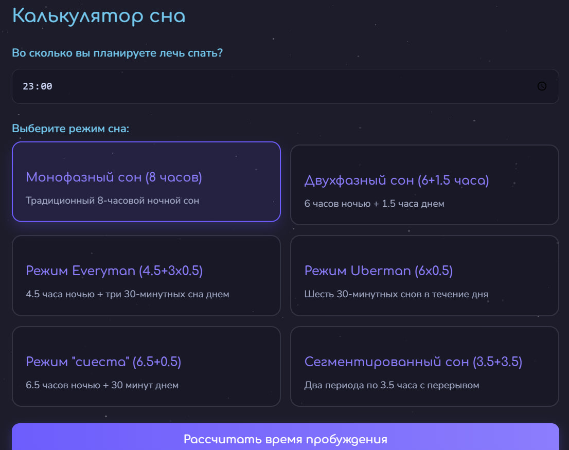 С этим калькулятором можно попробовать разные способы выспаться, а под ним - краткая справка обо всех режимах.