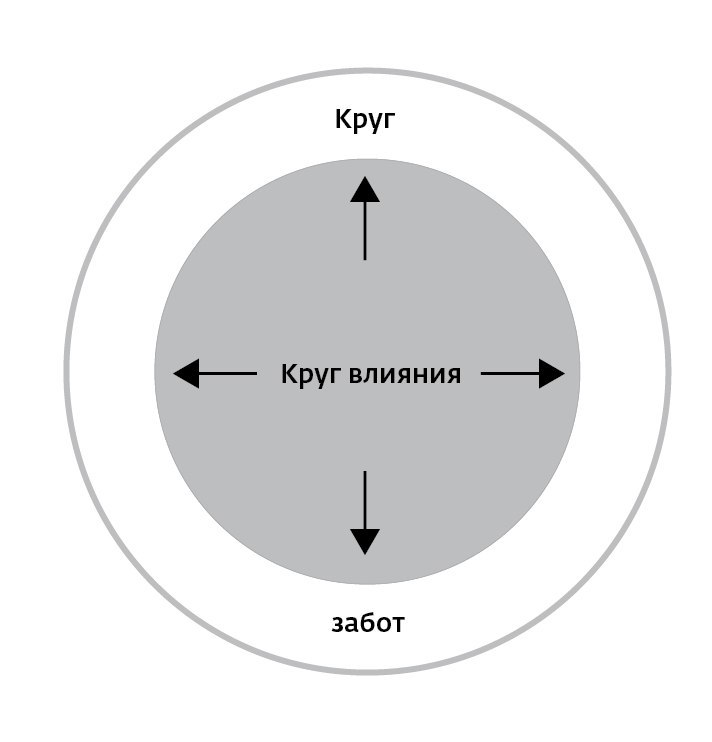 Самое интересное, что круг влияния всегда меньше круга забот, и мы всегда стараемся повлиять на круг забот, хотя фактически не можем это сделать. Такой подход пораждает много психологических проблем из-за того, что фактически мы не можем влиять на погодные условия, курсы валют (если мы не глава ЦБ РФ) и т.д.