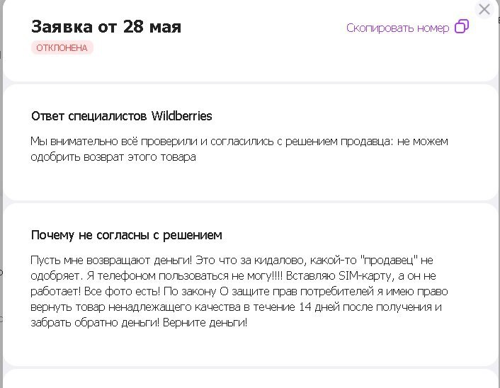 Я сразу написал продавцу в надежде на возврат такого товара, но мне он отказал. Более того, мне даже отказал Wildbrries, сославшись на то, мол "мы провели удаленную проверку качества и не можем вам ничем помочь", внаглую нарушая закон "О защите прав потребителей".