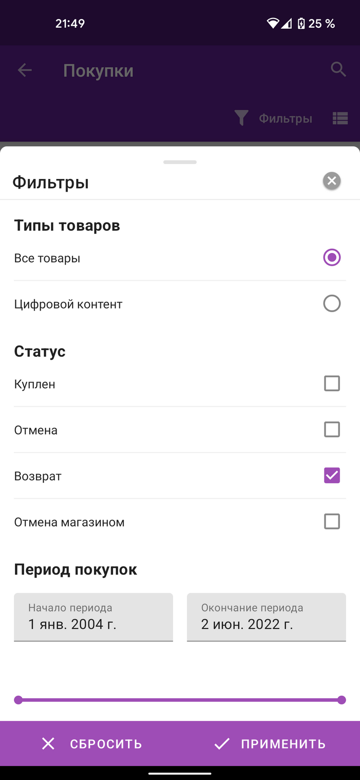 Далее ставим фильтр на "Куплен".