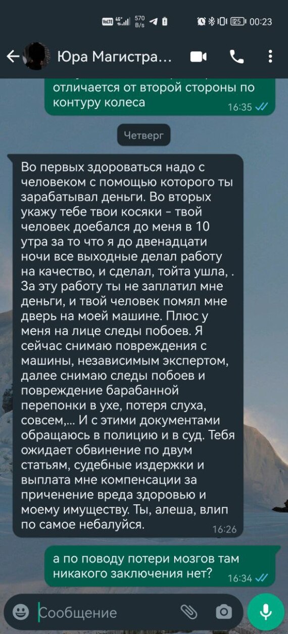 Юрец со всем согласился, пожали друг другу руки, сказал ему спасибо за работу, он собрал свой скарб и исчез в закат. Через пару дней приехал тот самый клиент. Косяк в работе действительно был, хоть нашли мы его и не с первого раза. Долго пытались понять, что клиенту не нравится. В общих чертах, клиенту восстанавливали заднее крыло после ДТП и в общем, заводское крыло с другой стороны по тонкой кромке вдоль арки колеса имеет слегка выпуклую поверхность. А Юра же на другой, ремонтируемой арке, сделал эту поверхность плоской. На взгляд - вообще не понятно. Я был готов к чему угодно, но не к такому. Минут 20, наверное, кружил вокруг авто, пока понял, что именно не нравится человеку. Но как говорится, бросается в глаза, не бросается, но заказчик уже знает о данном косяке и его глаз всегда будет падать на него при виде своей машины. Посему было принято решение геометрию крыла поправить и перекрасить его. Написал Юрцу, чтобы согласовать, когда тот сможет подъехать, доделать работу и получил следующее: