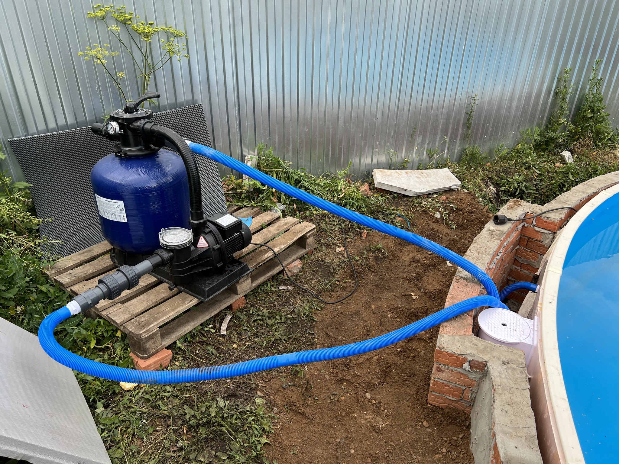 На этом этапе я устал прятаться от дочери и ее вопроса: Когда мы уже будем купаться? И было решено на скорую руку подключить фильтр и начать подготовку воды к ее прямому назначению.