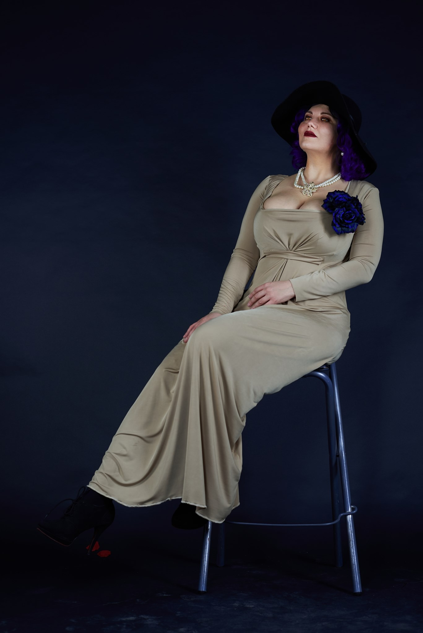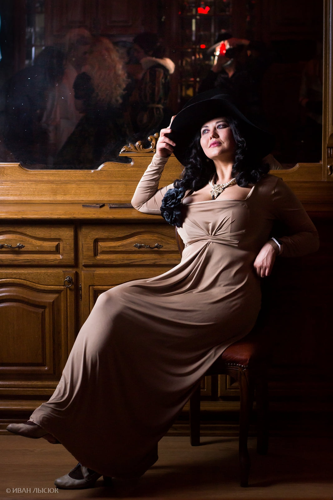 Сделать узнаваемой героиню было достаточно просто, цветы нашлись у подруги, шляпа у клиентки на массаж, жемчужные бусы и серьги остались от костюма на Ренессанс, а платье мы с подругой пошили на коленке, ткань обошлась в 300 грн. Парик тоже нашелся (который черный, фиолетовые волосы на некоторых фото мои).