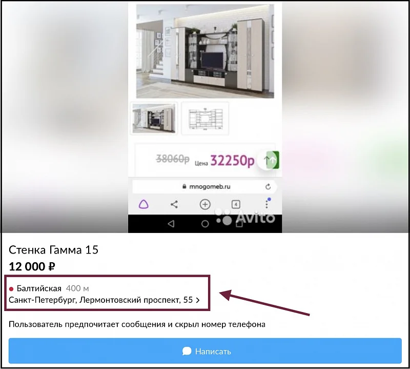 — И вишенка на торте: открываем второе объявление — опа, наш продавец как-то «переехал» в Питер, плюс фото явно скачано с первой страницы Гугла.