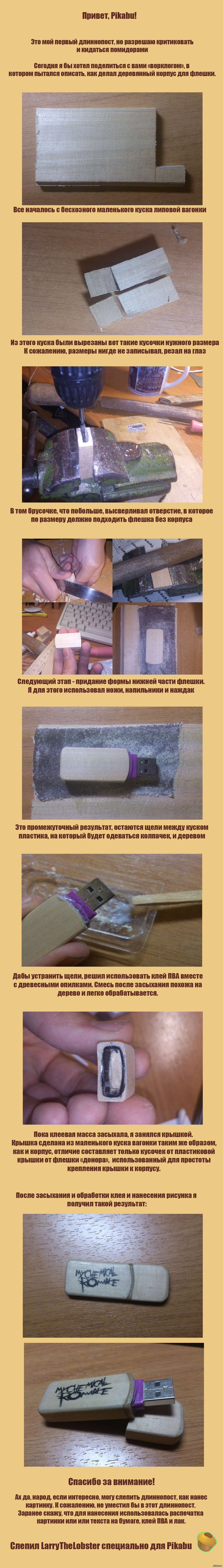 594 LarryTheLobster Хобби Как я делал деревянный корпус для флешки. 11 лет назад Нужен был подарок на день рождения, хотелось подарить что-то душевное, сделанное своими руками. Так родилась идея деревянного корпуса для флешки. [моё] Флешки Ручная работа Работа с деревом Длиннопост Моё