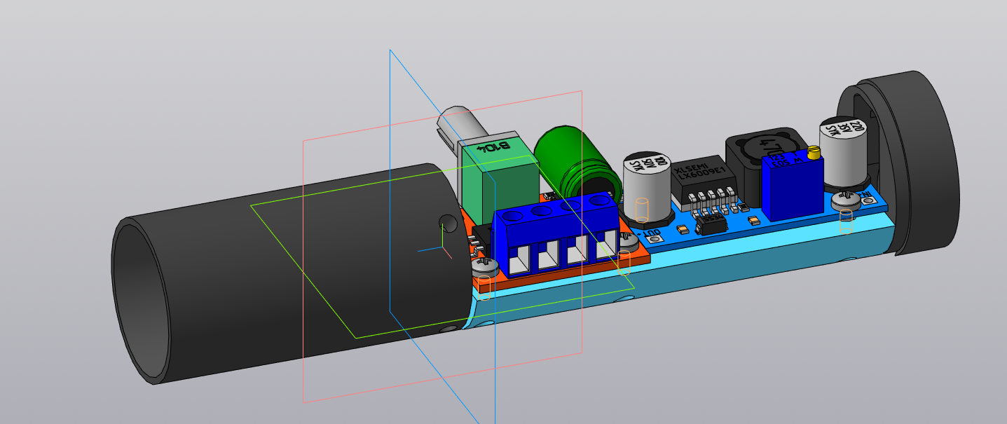 Еще на этапе выбора компонентов было ясно, что использовать штатный потенциометр (крутилку для настройки оборотов) нет смысла, он большой, да и расположен не с самой удачной стороны (выходит в бок платы). по этому его пришлось убрать и искать другую замену, ну это потом... Пока делаю чертеж фиксатора плат в трубе! Тут уже в чертежах я заложил втулки для установки без сверления.