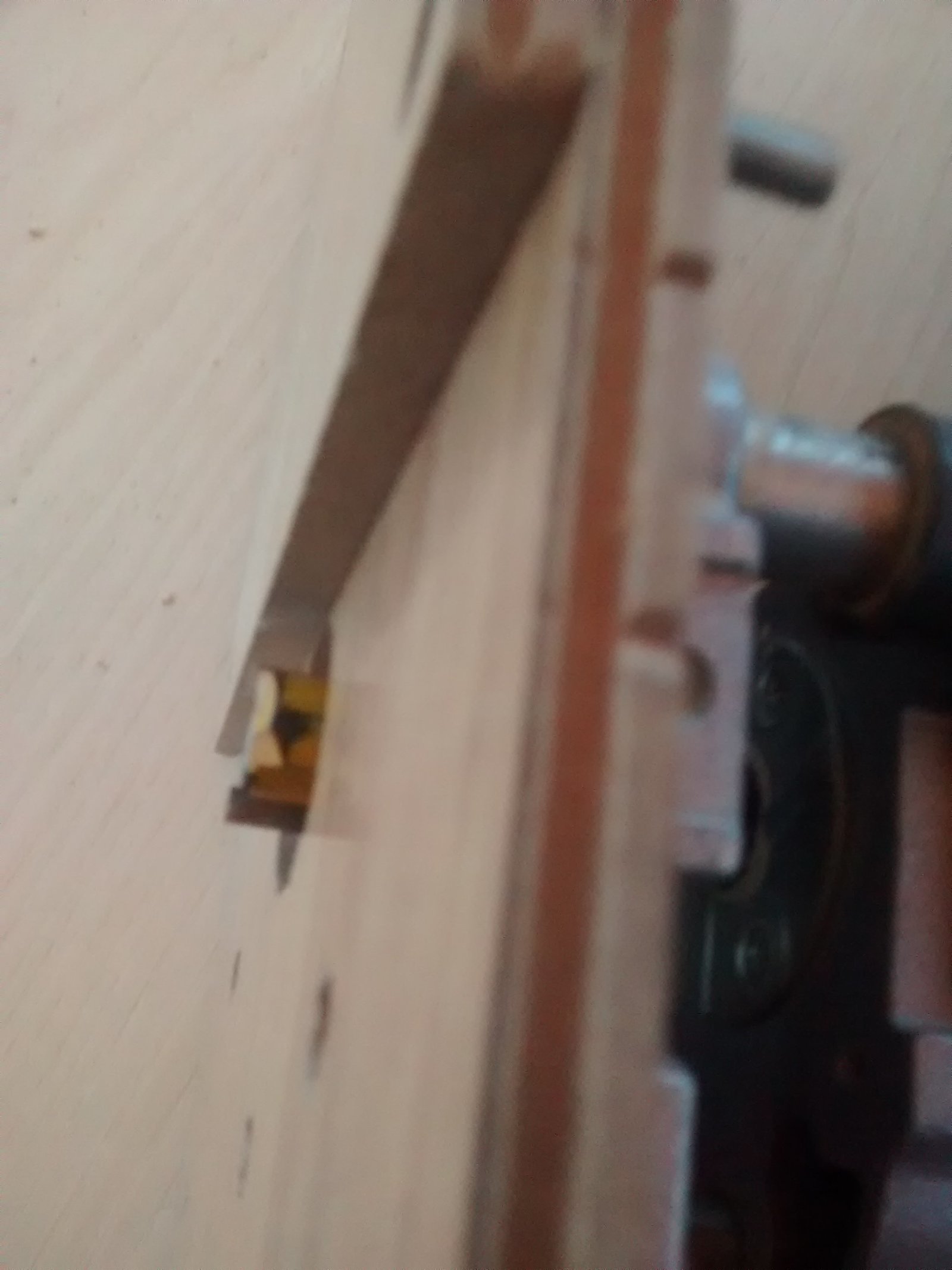 После высыхания клея я обрезал торцы коротких реек, и выровнял их поверхность относительно столешницы с помощью вот такого колхозного приспособления: