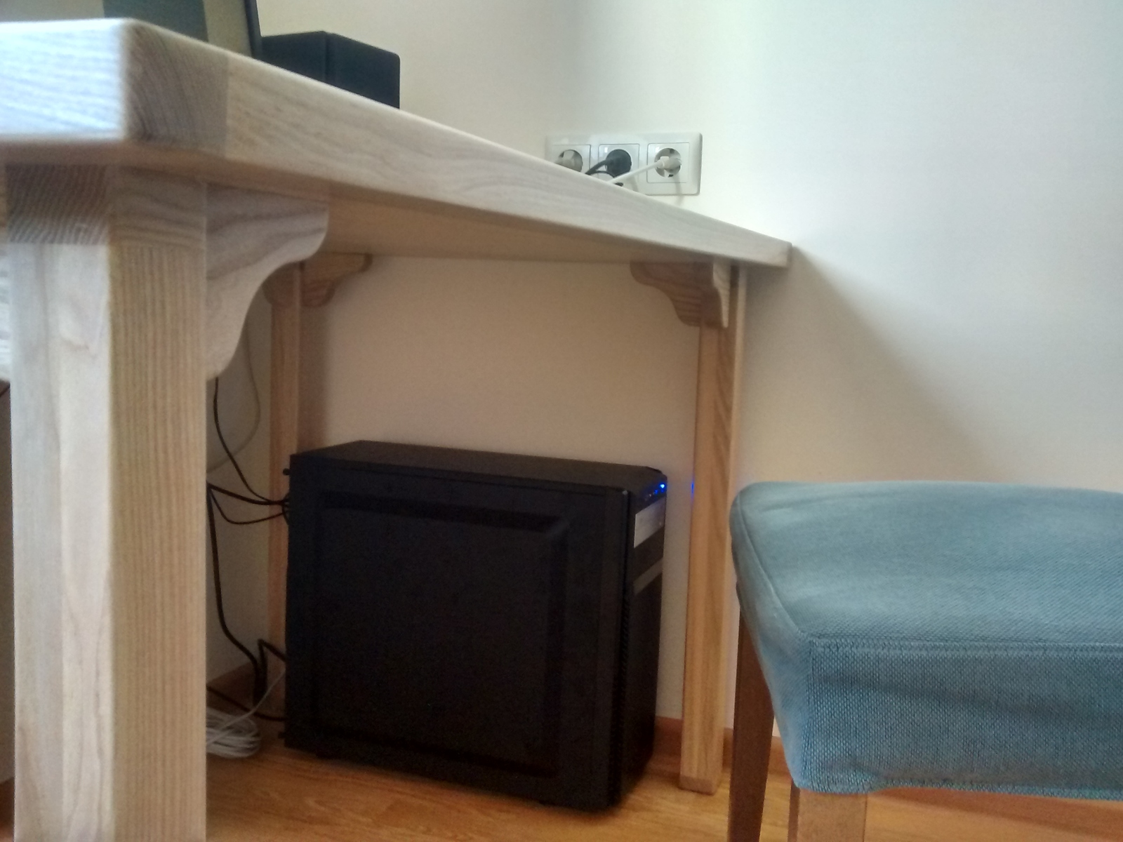 Результат мне очень понравился. Стол получился ООООЧЕНЬ тяжелый (и немудрено - мало того, что ясень, так еще и два слоя МДФ). Работаю за ним уже полгода, ощущения прекрасные - сочетание физической тяжести и непоколебимости с визуальной легкостью, мощь, и спокойный цвет натурального ясеня. И немного фото готового стола: