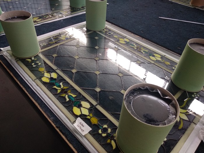Витраж промазывается прозрачным герметиком, сверху стекло будущего стеклопакета и под пресс. Оставляем на ночь.