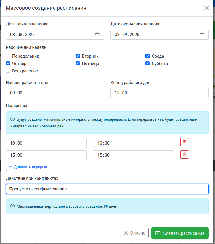 Приведу пример, чтобы было понятно, что я имею в виду, говоря о гибкости. Как задается рабочее расписание в других системах? Обычно есть два подхода: либо фиксируется график наподобие таблички на дверях, либо вручную создаются слоты. Оба подхода имеют недостатки: создавать слоты вручную утомительно, особенно при необходимости перерывов, а фиксированное расписание недостаточно гибко. Иногда хочется поработать подольше, а иногда надо уйти пораньше. У меня объединены оба этих подхода. Есть возможность массового создания расписания:
