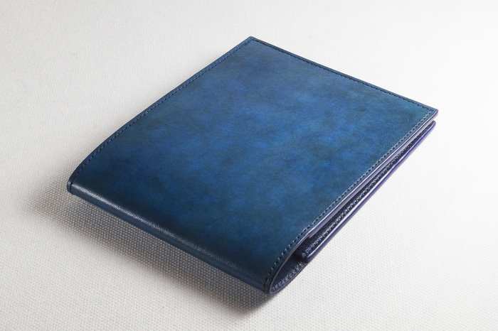 После этого я окрашиваю лицевую часть в один из множества цветов, всё зависит от пожеланий клиента. Это портмоне должно быть тёмно бирюзового, что-то вроде морской волны. красим в базовый цвет - голубой(на фото деталь свеже окрашена, после высыхания цвет станет значительно светлее):