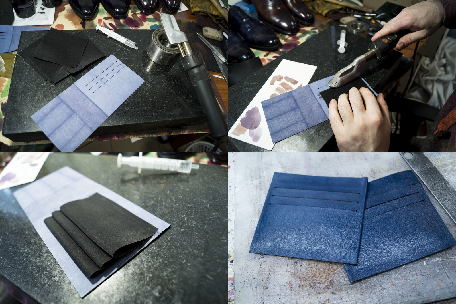 Теперь предстоит сделать отделения для пластиковых карт. Для приклеивания шёлка отлично подходит полиуретановый клей (наносить тонкий слой удобно используя шприц). Используем утюжок для надёжного приклеивания, однако нужно быть достаточно осторожным и не перегреть заготовку, т.к. шёлк, и кожа материалы природного происхождения и при нагреве могут деформироваться и портиться.