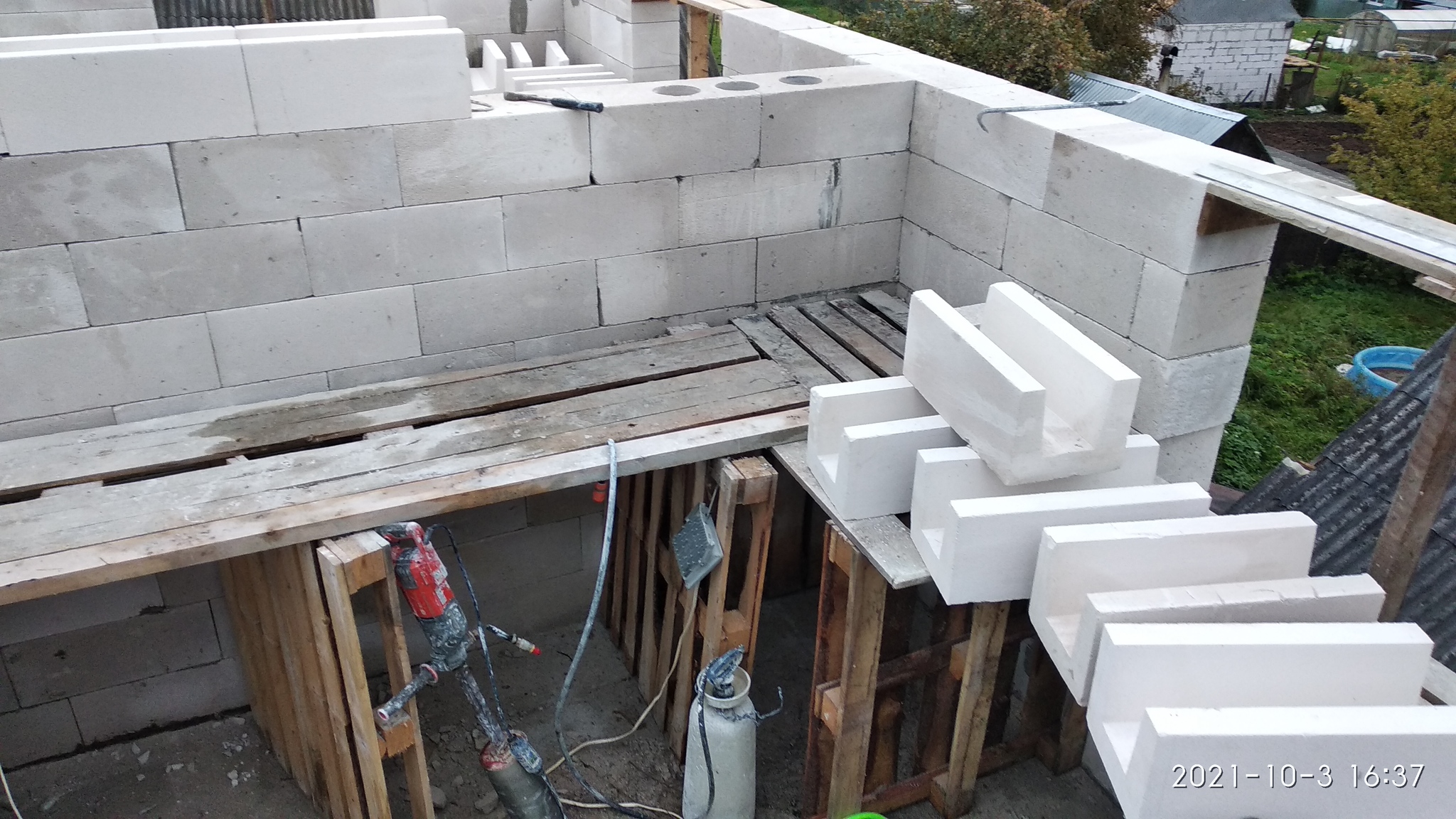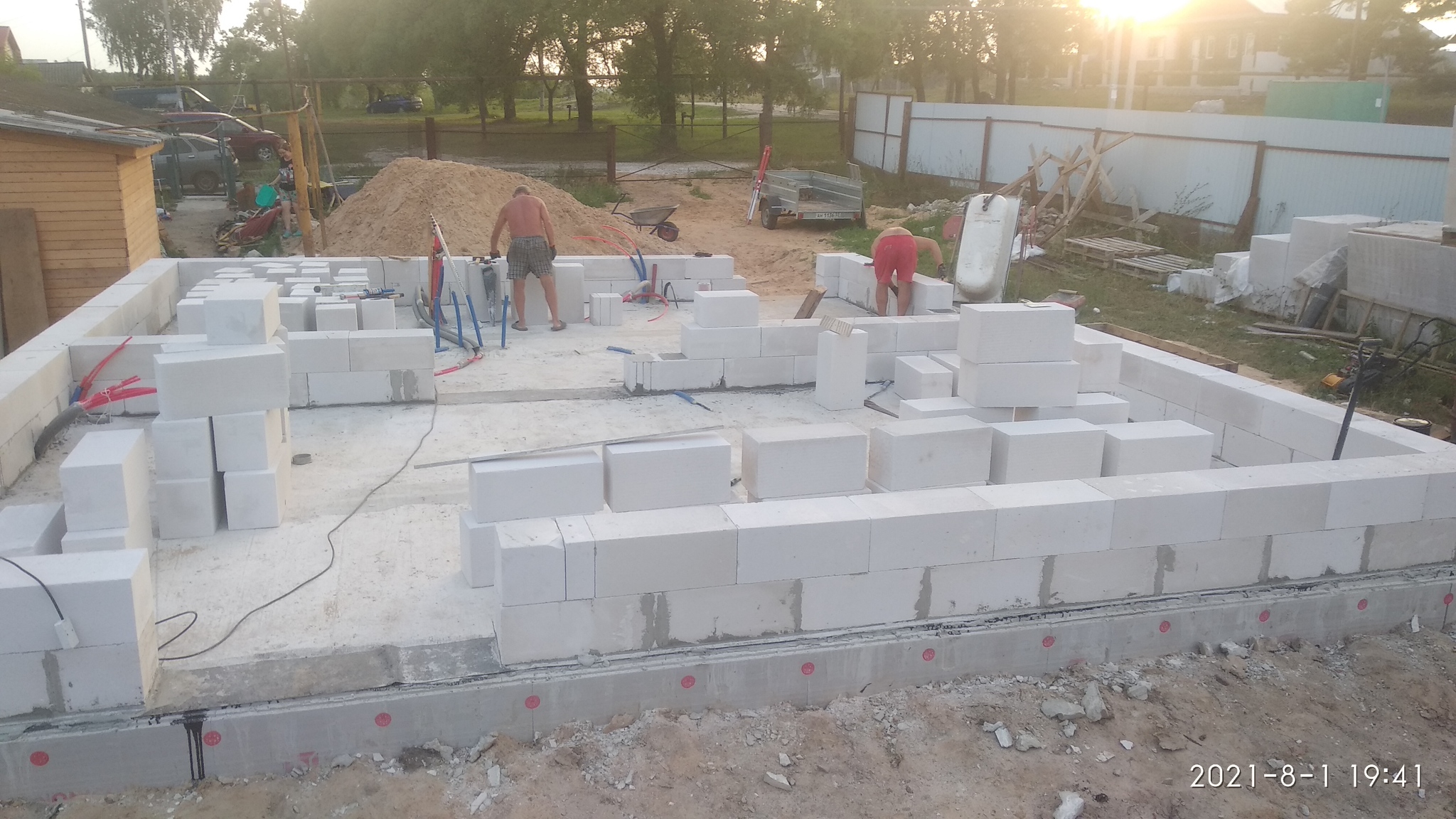 Мой день проходил так, утром подьем через боль и страдания, поход на работу, вечером проложить 1 ряд блоков, натаскать на следующий день и спать. Никаких телефонов, позалипать в ютубчик и прочего. просто добраться до кровати и рухнуть. благо лето и длинный день позволял работать до темна с полной отдачей.