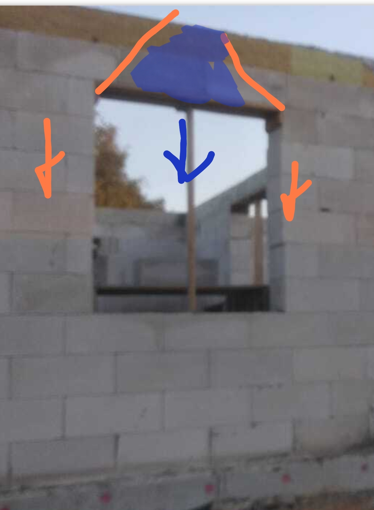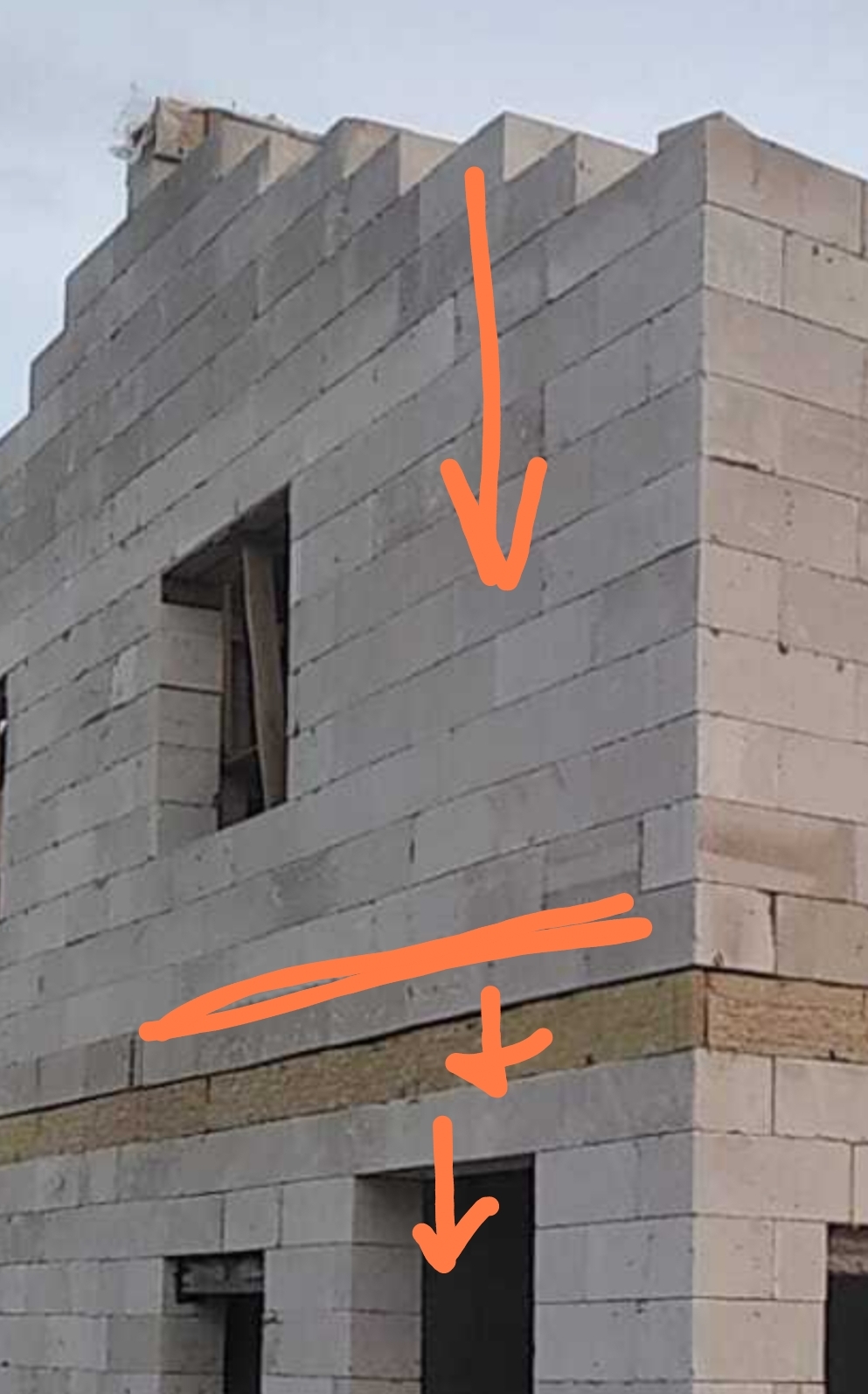 перемычки над окнами не стал делать, вместо этого проложил подпорки, на них положил блоки, склеенные между собой, а мы же помним как держит клей пена. И чтобы совсем точно ничего не рухнуло, наверху в блоках насверлил арматуры под углом. Получалось что над верхними блоками был армопояс, на котором висели надоконные блоки, точнее висел один блок, так как крайние входили в защемление между армопоясом и стеной. Как то коряво написал объяснение, видимо не зря упорно хотят влепить тег Рукожоп.)))