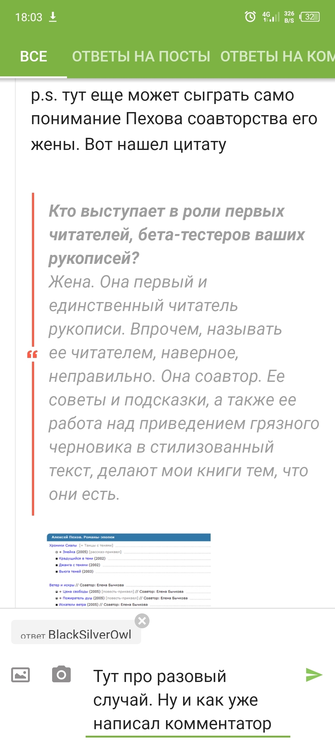 p.s. тут еще может сыграть само понимание Пехова соавторства его жены. Вот нашел цитату