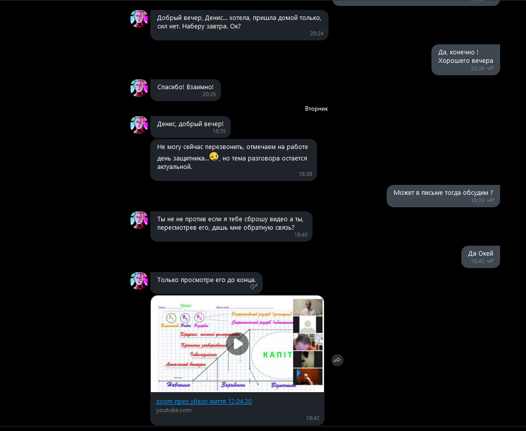 Однако, в чём соль этой истории, так это в том, что она попросила меня через пару дней с ней созвонится и поговорить о серьёзном деле, потом написала что устала и я предложил обсудить серьёзный вопрос в текстовом режиме.