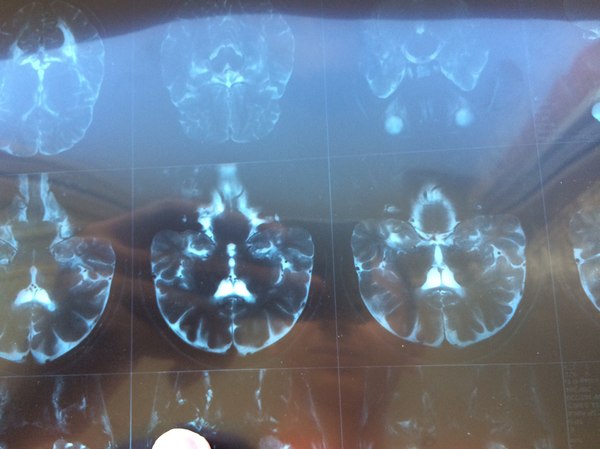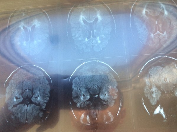 Тут было не всё так просто. Да, МРТ было у меня на руках (вот пара снимков оттуда. Несимметричные светлые пятна - очаги или бляшки). Немного очагов - был момент ремиссии.