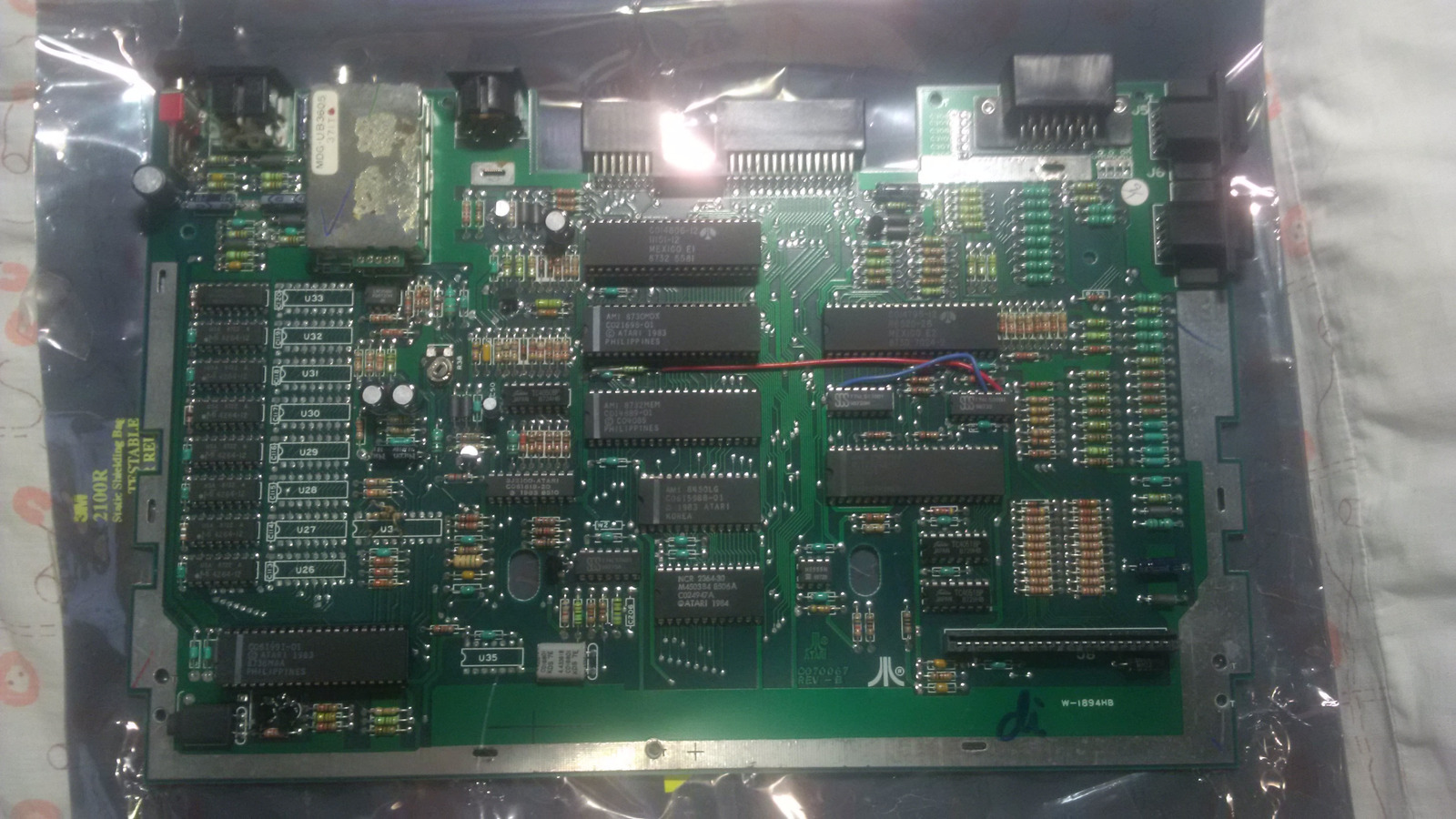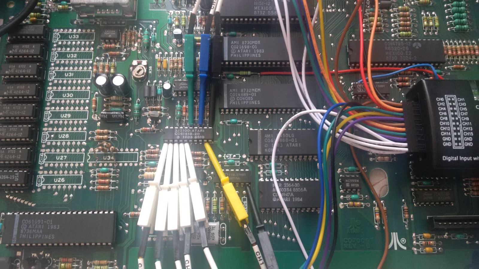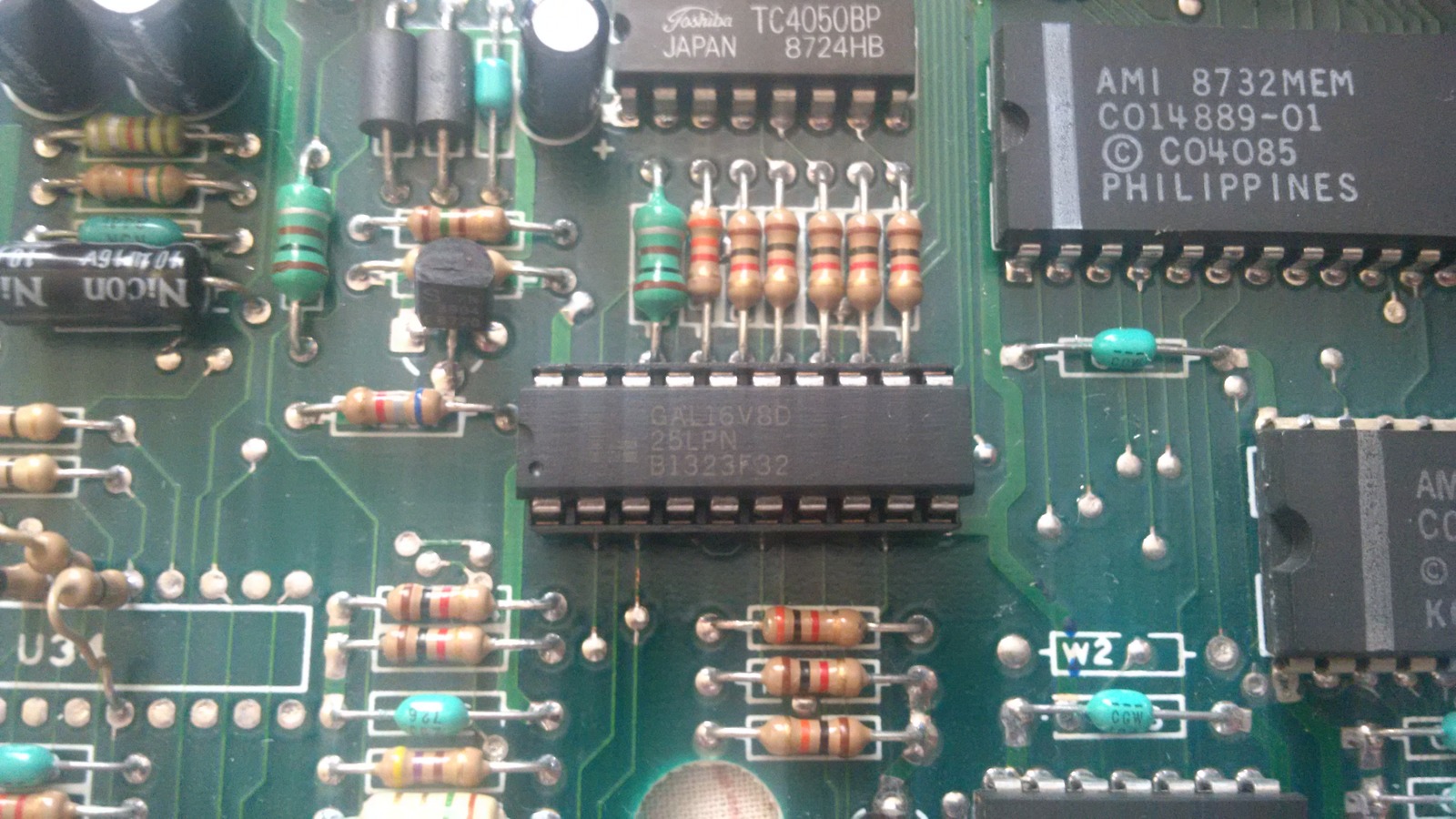 Подозрительный товарищ - на всех входах что-то да происходит, а на выходах ни шиша. Наметился главный подозреваемый. Хорошо хоть за страшной надписью ATARI C061618-20 (что обычно намекает на кастомную природу микросхемы) кроется обычная PAL16L8, микросхема программируемой логики, для которой даже есть исходники. За что, кстати, огромное спасибо сообществу атариводов. Плохо только то, что заменить её мне было нечем, пришлось отложить плату на пару недель до приезда из Китая горстки аналогичных микросхем.