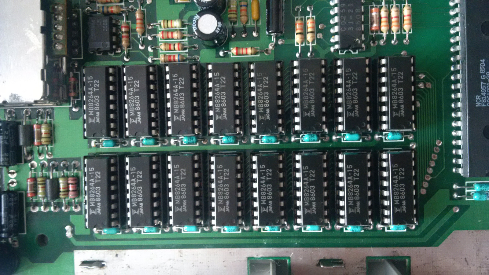 16 отверстий под ножки микросхемы * 8 чипов на банк * 2 банка = 256 отверстий! Ставим панельки, а в них новые, заведомо исправные микросхемы памяти: