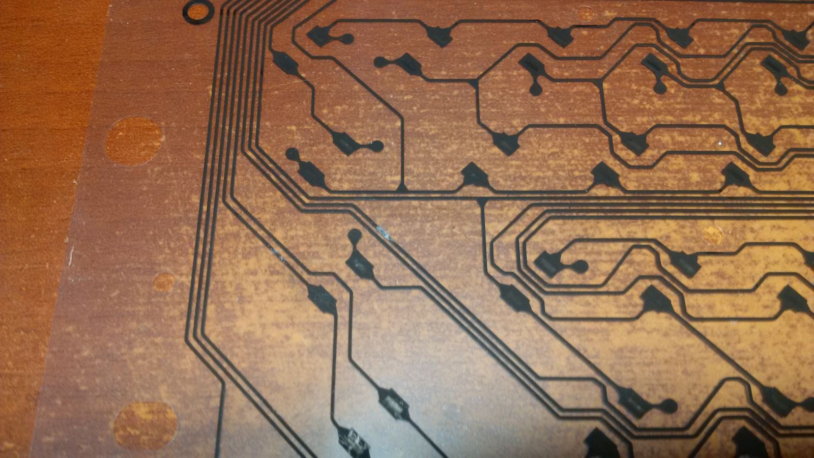 Вспучившиеся окислившиеся участки отчищаем и перерисовываем уже лет пять как просроченным "контактолом" (токопроводящий клей). Где можно - аккуратно рисуем одиночные дорожки, где нельзя - ставим жирную кляксу, а потом иголкой процарапываем "междорожечные пространства":