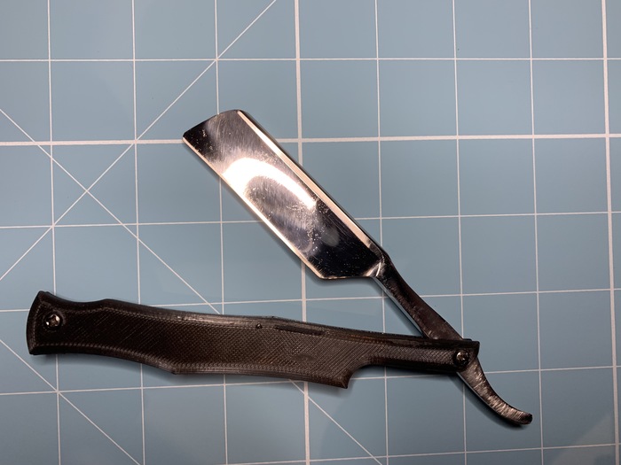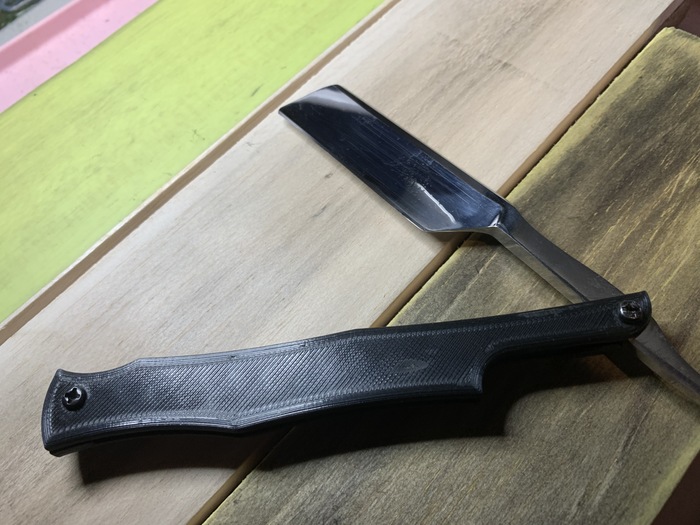 Дальше мы тупо заполировывам полотно бритвы насколько можем и думаем, что делать с рукояткой. С полировкой все плохо: все лезвие в кавернах и питтинге, который практически не выполировывается. Примерно в это же время я заметил, что у лезвия конский прогиб в середине, и решил дальше не парится. Напечатал на 3д принтере простейшую рукоять, привинтил болтиками на locktite и на этом решил трансформации пакистанского говна прекратить.