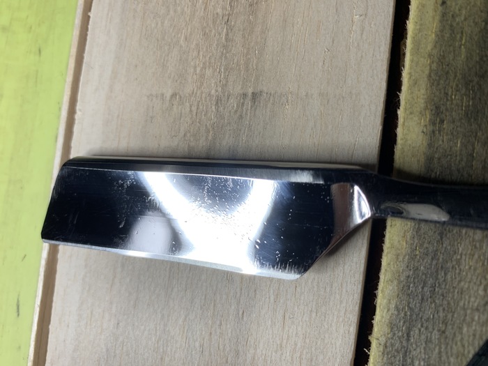 Результат: бриться можно, и неплохо. Заточку железяка держит, но доведение до результата за который будет не стыдно потребует конских затрат времени и дорогих абразивов. И меня реально давит жаба и на довод косметики, и на нормальную ручку. Более того, косяк в геометрии у бритвы почти фатальный: обух заметно сужается, и реграйндить это достаточно непростая задача.