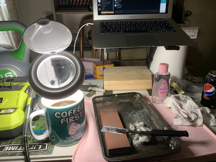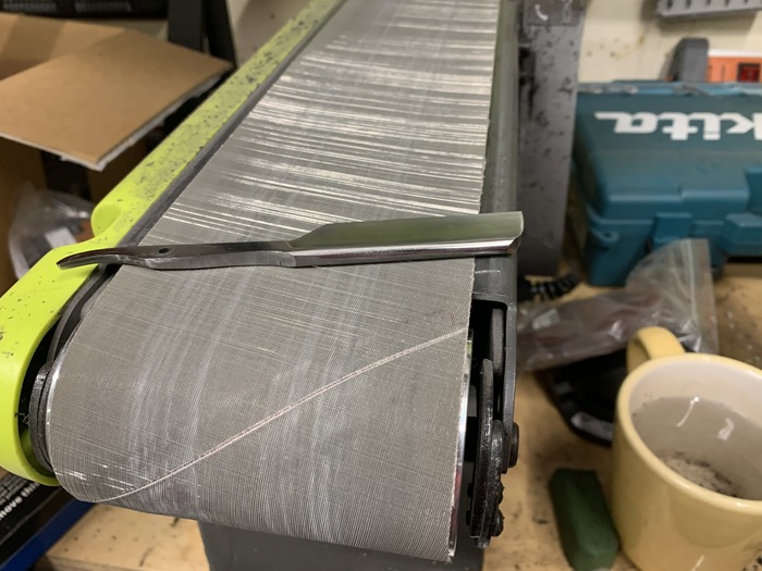 С грайндером дело пошло бодрее и в целом черновая обработка закончилась. 3М тризакт, к слову, офигенные ленты: очень предсказуемо снимают материал и оставляют отличную поверхность. На 2000 тризакте можно вообще точить ножи сразу до уверенного бритья руки без промежуточных абразивов вообще. Дорогой только, падла.