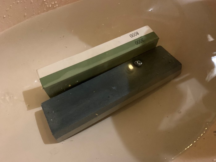 Важным моментом на этом этапе является не перепутать, и не замочить обычный (или масляный) точильный камень вместо водника. Определить его легко по звуку.