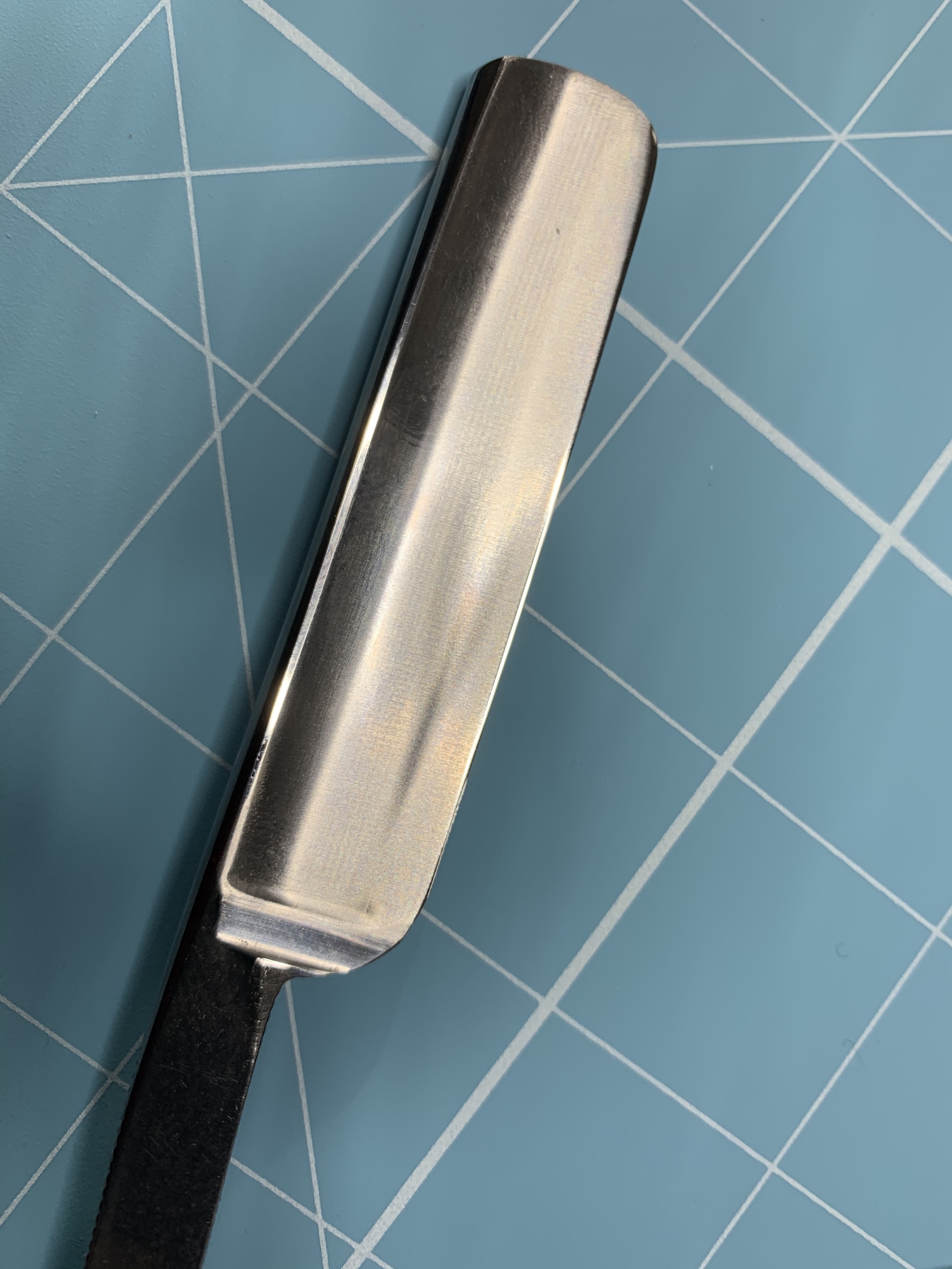 Результат: бриться можно, и неплохо. Заточку железяка держит, но доведение до результата за который будет не стыдно потребует конских затрат времени и дорогих абразивов. И меня реально давит жаба и на довод косметики, и на нормальную ручку. Более того, косяк в геометрии у бритвы почти фатальный: обух заметно сужается, и реграйндить это достаточно непростая задача.