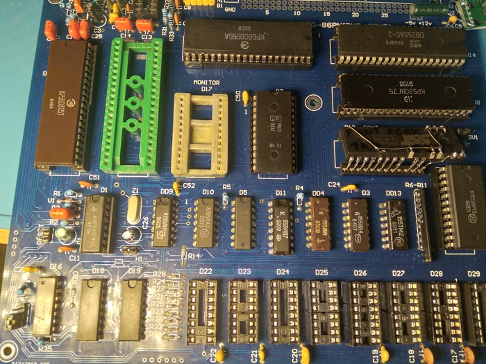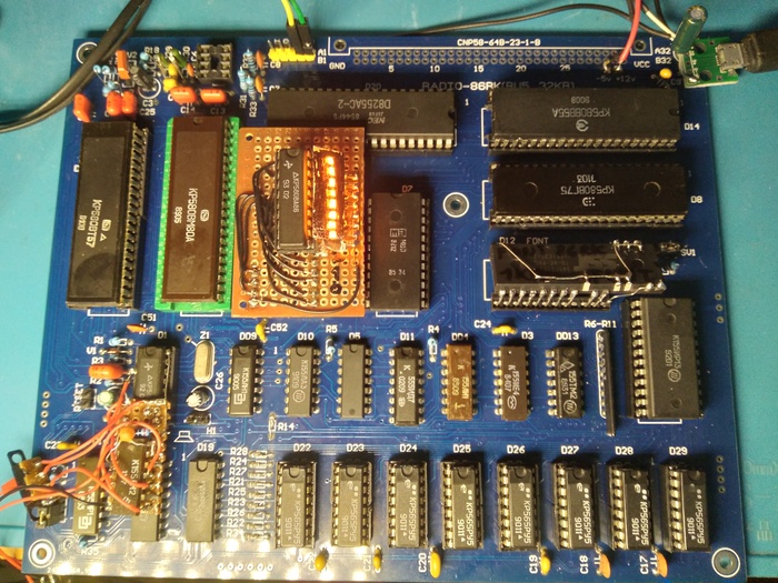 Тот "кларнет" справа - это "выход из ситуации": были микросхемы только большого объема, пришлось уменьшить, и наклонить, т.к. она не помещалась по размеру. Собрали. Теперь давайте попробуем включить, без установки процессора (чтобы раньше времени его не спалить):