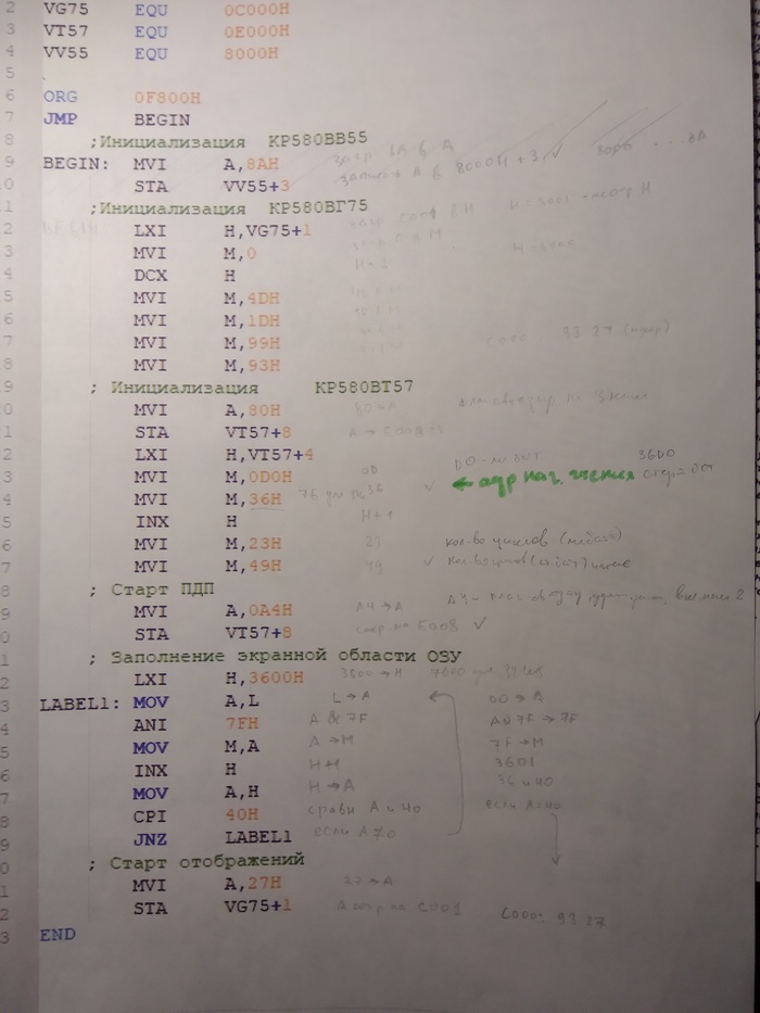 Данная программа после сборки загружается в ПЗУ. Она позволяет инициализировать периферию, после чего заполнить экран компьютера символами. Далее я более подробно расскажу, как она работает. Приводится, также, "развёртка" данной программы по выполняемым командам: