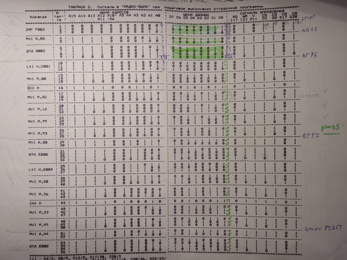 На удивление, увиденное на лампочках полностью совпадает с приведённой распечаткой. Это значит, что процессор работает, периферия работает. Однако, проблема ведь где-то есть? Пришлось обратиться к литературе, где показано, какие линии следует проверить более подробно. Взял литературу из журнала "Радио". Всё совпадало вплоть до одного момента:
