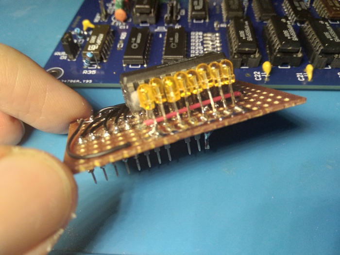 Приспособление №1: на микросхему "ПЗУ" цепляются светодиоды, чтобы посмотреть, исправны ли её линии данных.
