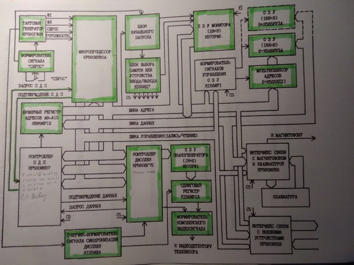 Для определения неисправности понадобилась схема - зелёным цветом я отмечал на ней те узлы, которые, по моему мнению, точно исправны, так как были проверены заранее на приборах. На этой же схеме я делал рабочие пометки:
