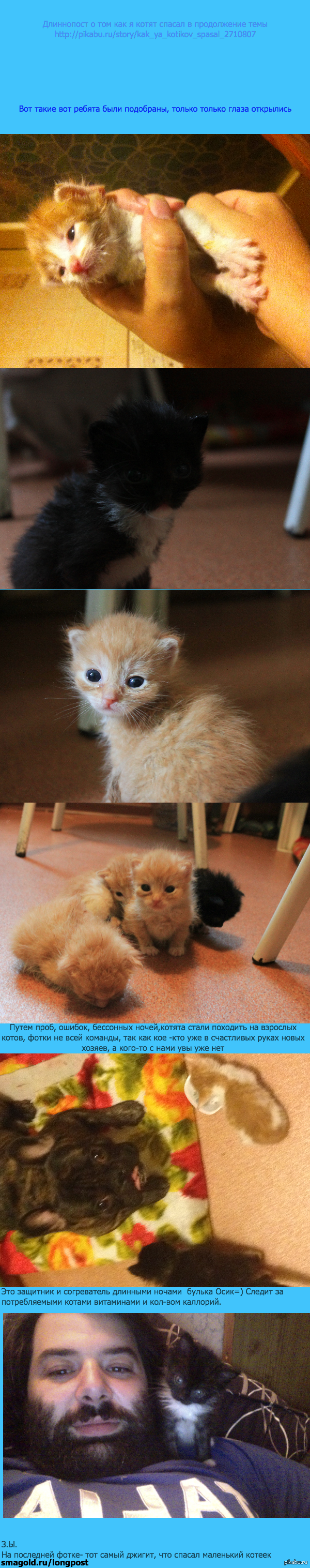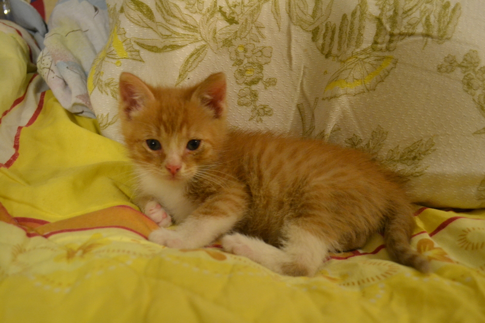 Я тут в конце сентября тоже спасла рыжего котейку. На сайте города увидела объявление женщины, что у соседнего дома котенок маленький плачет один с больными глазками. Увидев его фото, просто не смогла не пойти. Пришла туда, а он там и правда маааленький и один. Отнесла к ветеринару, промыли и намазали глазки, сделали уколы и покормили. Прописали терапию в 10 дней. Я у ветеринара забыла купить поилку, узнала нечаянно, что совсем рядом с домом открылся зоомагазин, зашла туда, а там в клетке такой же мелкий и рыжий сидит, как увидели друг друга, так давай рваться, и принесли его несколькими дням раньше почти из того же места, что и я этого. Видать братья. Почти сразу нашлась хозяйка котику, завтра он обретет новый дом! ^_^