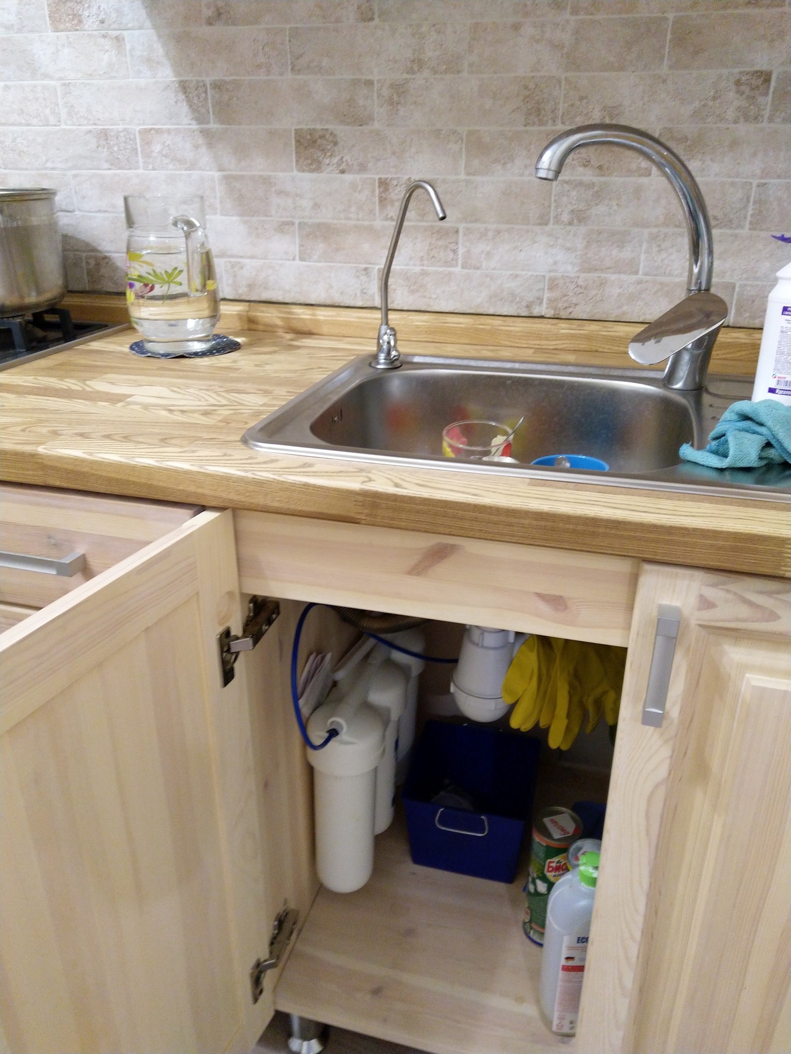 Данная кухня создавалась параллельно с ремонтом. Не было цели всё сделать идеально, так не бывает. Зато я уже знаю какие я сделал ошибки, какие тонкости не учёл. Что то упустил из виду, на что то просто забил. Делал всё один. Ушло 2 месяца. По деньгам чисто на гарнитур (помимо ремонта) с мойкой, фурнитурой ушло около 50к летом 2017 года. Деревянная мебель ведёт себя прекрасно. На столешнице след может оставить только концентрированная щелочь. Считается что воду можно пролить и уйти. Но я всё равно не оставляю, дисциплинирует.