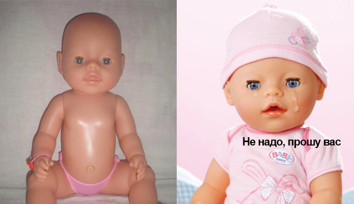 А дальше случился прикол: моя жена с детьми уехала на неделю, я остался один, и как назло именно в это время наметился покупатель. Причём за покупкой девушка отправила своего мужа (видимо, сама ехать постеснялась). Приезжает серьёзный деловой человек, и мы проверяем эту куклу и так и сяк, заливаем воду в рот, пока у неё слёзы не потекут, затем нажимаем на пупочек, сажаем на горшок...