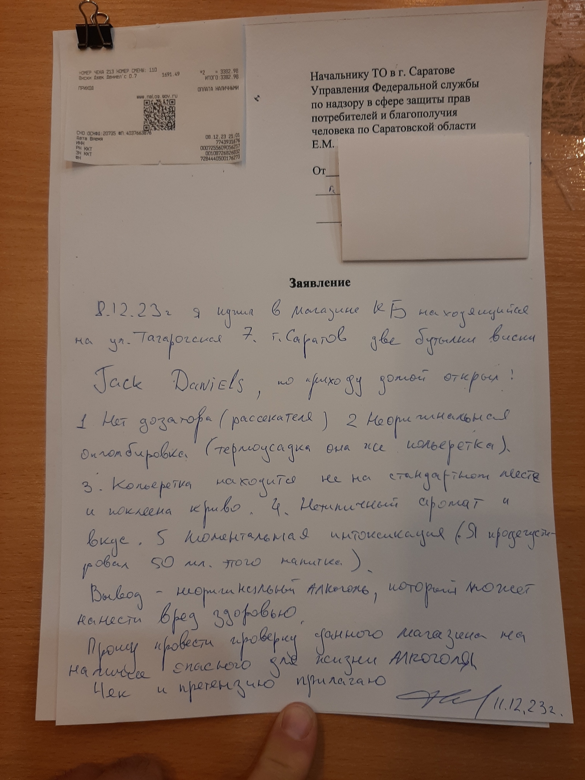 Сразу извиняюсь будет много текста. В пятницу 08.12.2023г решил прикупить алкоголя ( т.к. друг должен был приехать в гости с другого города), поиск решил провести в алкомаркете в доме. В этом магазине я уже покупал ballantines и всё было хорошо. В этот раз я решил взять джека( он был со скидкой при покупке 2-х бутылок). И вот я довольный начинаю открывать одну,чтобы продегустировать и отпустить груз проблем этого дня,а фантик которым пломбируется крышка невозможно снять руками(это сразу немного напрягло,т.к. я неоднократно был знаком джеком,и много раз его открывал....),хрен с ним ,взял ножик и срезал. Открыв крышку я не увидел дозатора.
