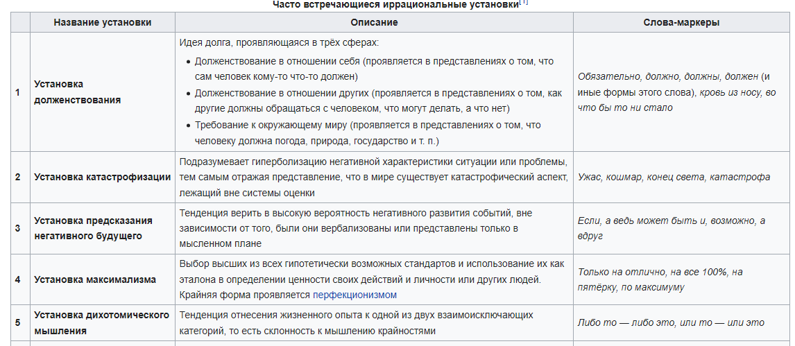 Просто 5 картинок из https://en.wikipedia.org/wiki/Rational_emotive_behavior_ther... с https://ru.wikipedia.org/wiki/Рационально-эмоционально-повед... и https://en.wikipedia.org/wiki/Cognitive_therapy с https://ru.wikipedia.org/wiki/Диагностика_иррациональных_уст...